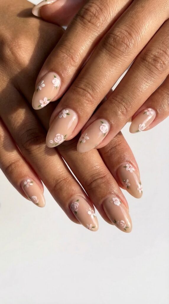 Neutral nude nails with delicate floral accents offer a versatile, wearable look that suits all skin tones. The nude base keeps the design clean and understated, while the small floral details add a soft, artistic touch. This combination works for any occasion, from everyday wear to more formal settings. It is a timeless, elegant choice for spring.