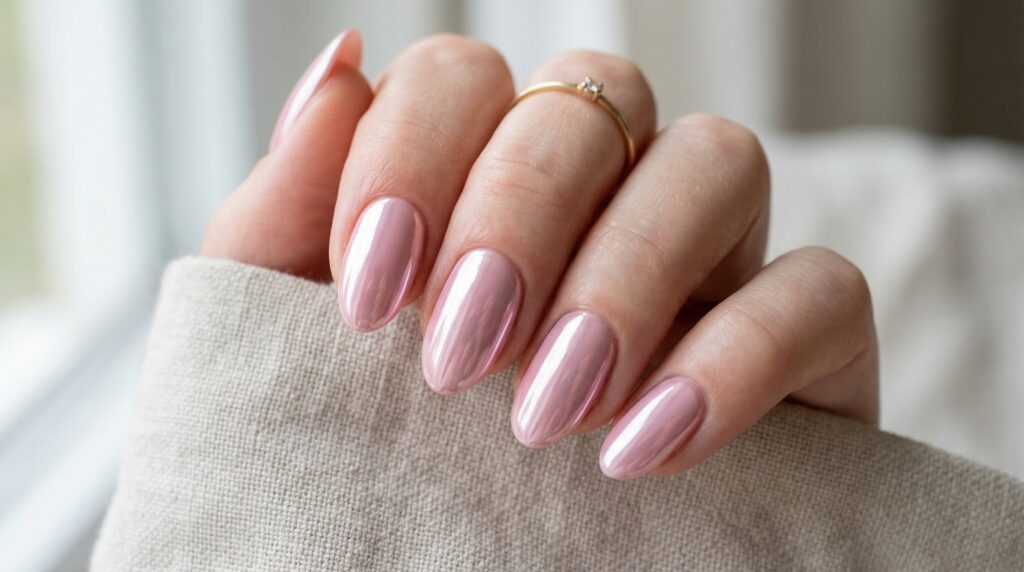 2. Chrome metallic nails in soft pink