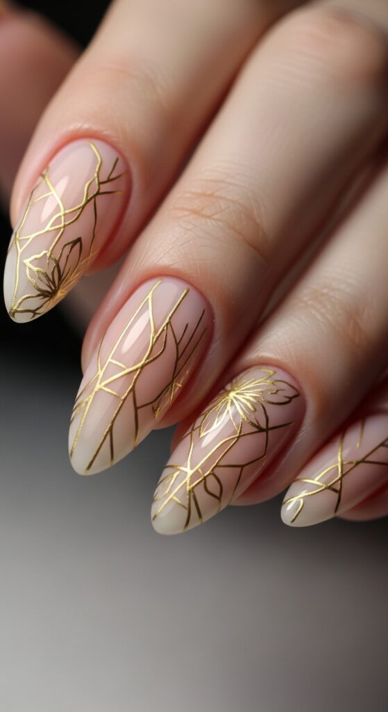 21. Pale peach nails with gold line art