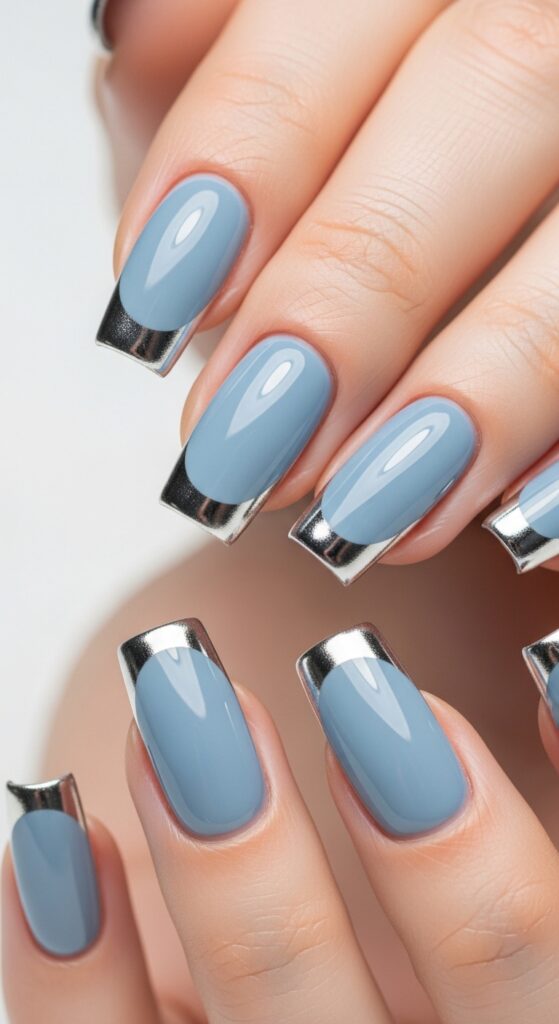 Powder blue nails with silver tips combine a calm, cool base with a modern metallic finish. The silver tips add a clean contrast that keeps the design polished and current. This look works well for both casual and formal settings. It is simple but eye-catching.