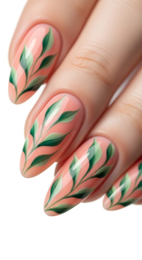 Soft coral nails with leaf patterns offer a warm, natural look for spring. The coral base adds a gentle warmth, while the leaf details bring subtle texture and interest. This design feels fresh and organic without being too busy. It works well on both short and long nails.