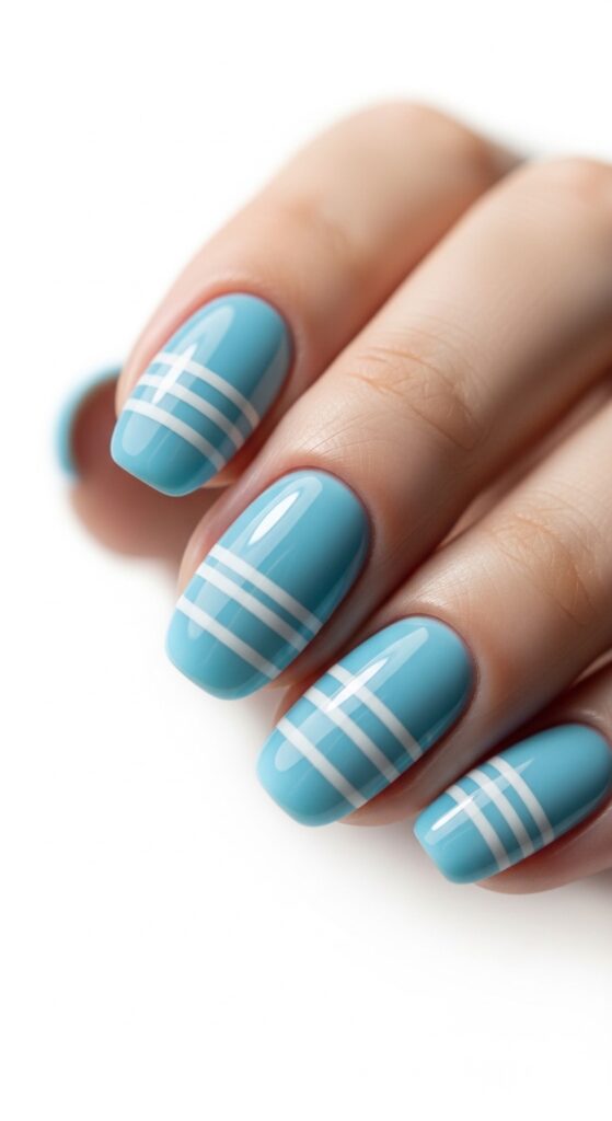 Baby blue nails with white stripes create a clean, modern look that is easy to wear every day. The thin lines add subtle detail without overwhelming the soft blue base. This design is neat and simple, working well for both casual and formal occasions. It suits all nail shapes and lengths.