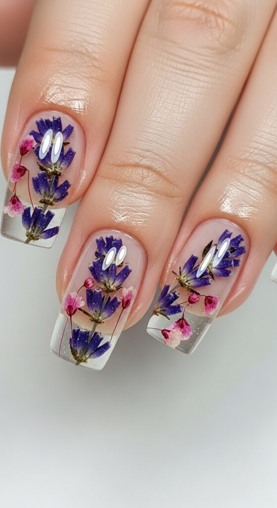 8. Clear nails with embedded pressed flowers