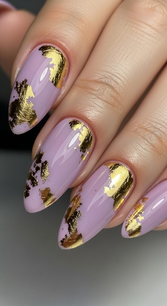 Glossy lilac nails with gold foil accents create an elegant, chic look for spring. The soft purple base pairs well with the subtle shimmer of the gold foil. This combination works for both casual and formal occasions. It adds a touch of luxury without being too overdone.