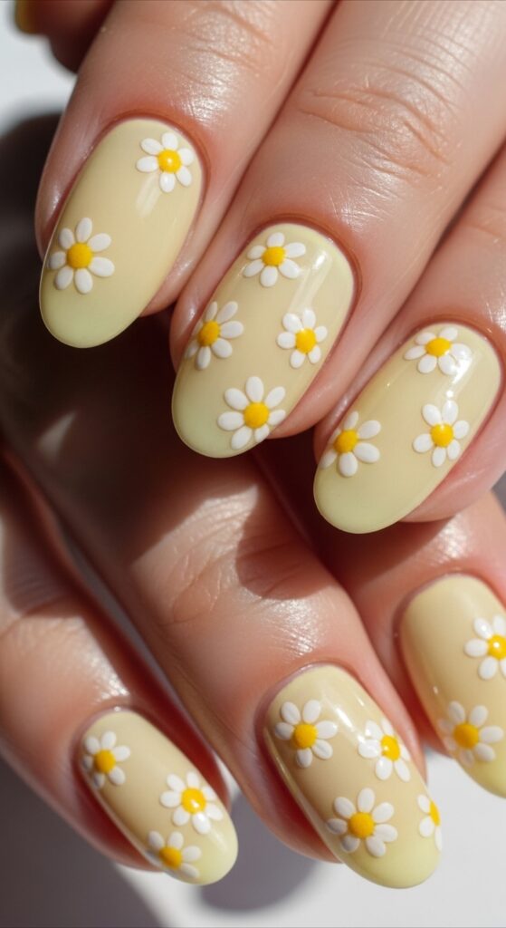 Soft yellow nails with daisy decals offer a light, fresh look for spring. The pale yellow base is bright without being too bold, making it easy to wear every day. Small daisy details add a delicate floral touch that fits the season perfectly. This design suits any nail shape or length.