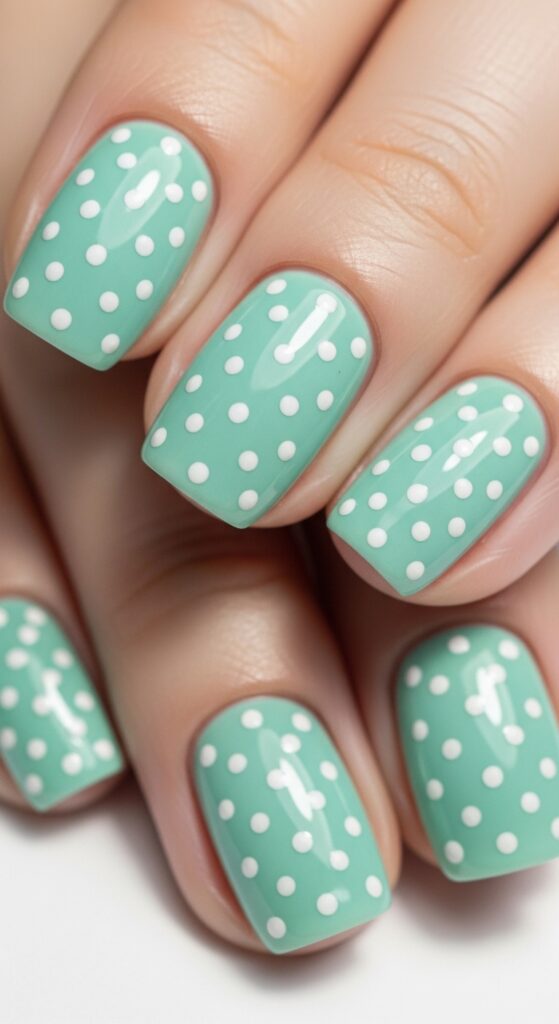 Mint green nails paired with white polka dots create a crisp, playful spring look. The soft green base is light and easy to match with any outfit. The dots add a simple pattern that keeps the design fun without being overwhelming. It works well on both short and long nails.