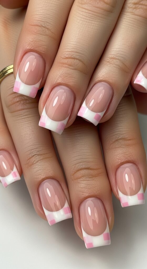 French tips with a pastel checkerboard pattern update the classic design with a fun, textured twist. The checkered detail adds visual interest while keeping the look fresh and seasonal. This style works well on short and medium nail lengths. It balances a modern pattern with a timeless tip design.