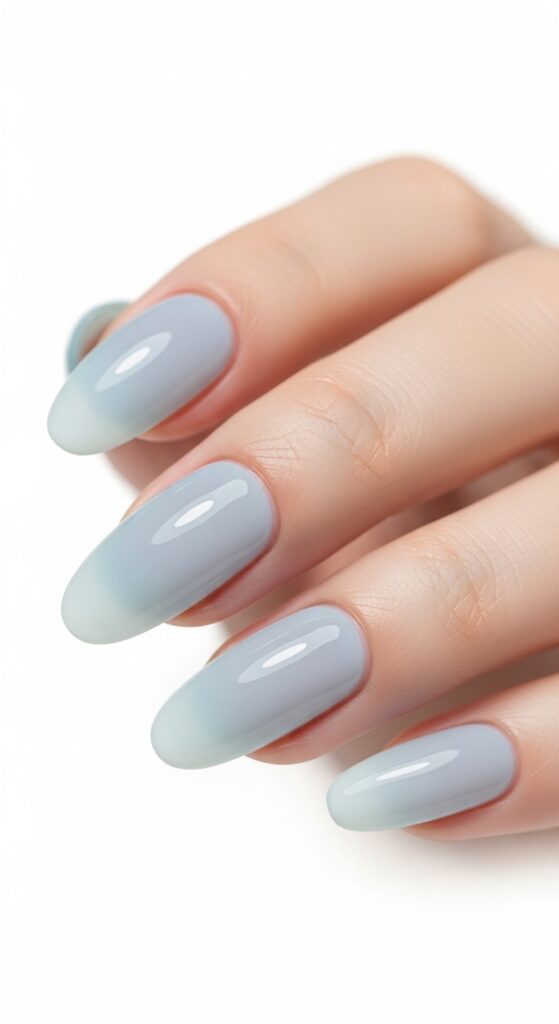 Pale blue frosted glass nails create a soft, translucent finish that feels cool and modern. The effect gives the nails a subtle depth that is unique and understated. This look works well on all nail shapes and lengths. It is a fresh, simple choice for spring.