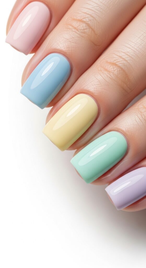Pastel rainbow color block nails offer a fun, fresh look using a variety of soft colors across each nail. Shades like soft pink, baby blue, and pale yellow work together for a clean, colorful design. The blocks of color are simple and modern, keeping the look playful without being bold. This style is perfect for those who want to try something different this spring.