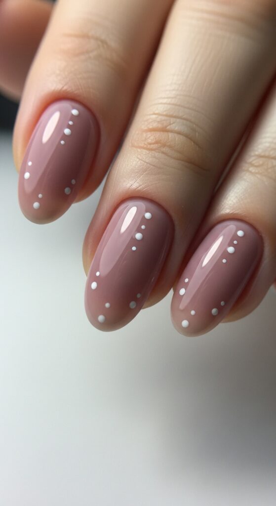 Soft mauve nails with small minimalistic dots create a gentle, refined look for spring. The mauve base is calm and easy to wear every day. The subtle dot detail adds a modern touch without being too decorative. It suits all nail shapes and works well for any occasion.