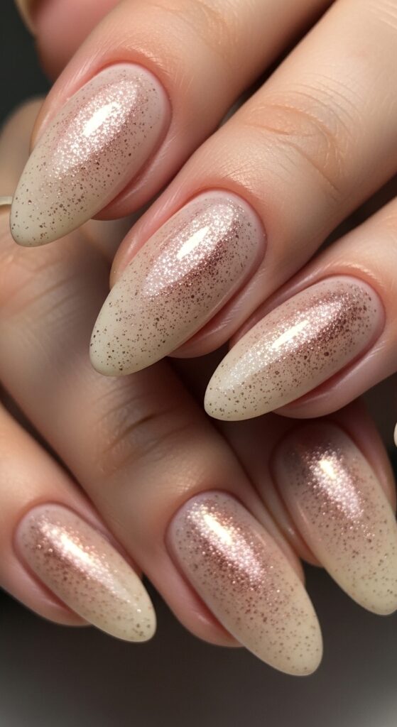 Creamy beige nails with rose gold shimmer offer a neutral, polished look that pairs well with any outfit or jewelry. The warm beige base is soft and versatile, while the rose gold shimmer adds a subtle, stylish touch. This combination works well for both casual and formal settings. It is an easy, elegant choice for spring.