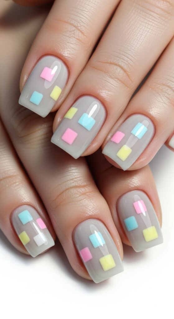 Light grey nails with pastel geometric shapes create a modern, playful look for spring. The neutral grey base balances the soft pops of color from the geometric accents. This design is neat and structured without feeling too bold. It suits those who want something stylish with a subtle twist.