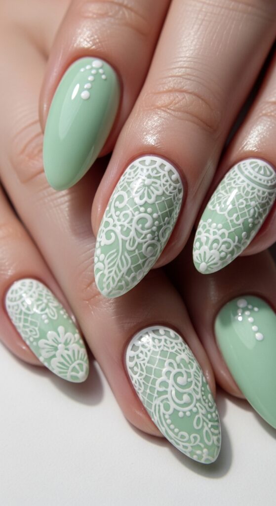 13. Pale mint with delicate white lace art