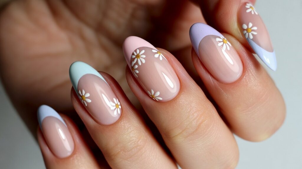 This design updates the classic French tip with soft pastel colors and small floral details. Tiny daisies or gold-centered blooms are added along the tips for a delicate, spring-ready look. The combination feels fresh and elegant without being too bold. It works well on both short and long nails.