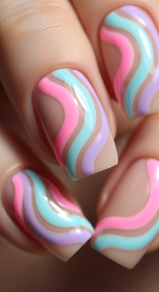 Swirl designs use curved lines in different colors to create a fluid, artistic effect. Pastel swirls over a nude base are especially trendy. Each nail can have a slightly different pattern, making the design unique.