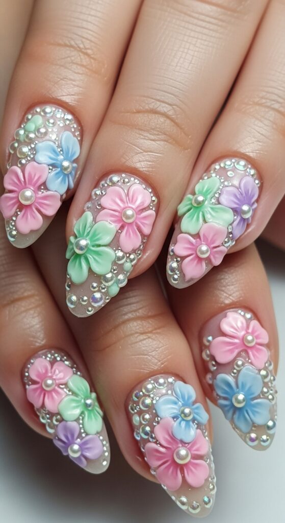 3D floral nails feature raised designs created with gel or acrylic. Flowers can be enhanced with small gems or pearls for extra detail. This style is more dramatic and often chosen for special occasions.