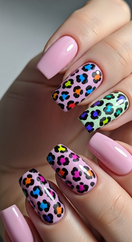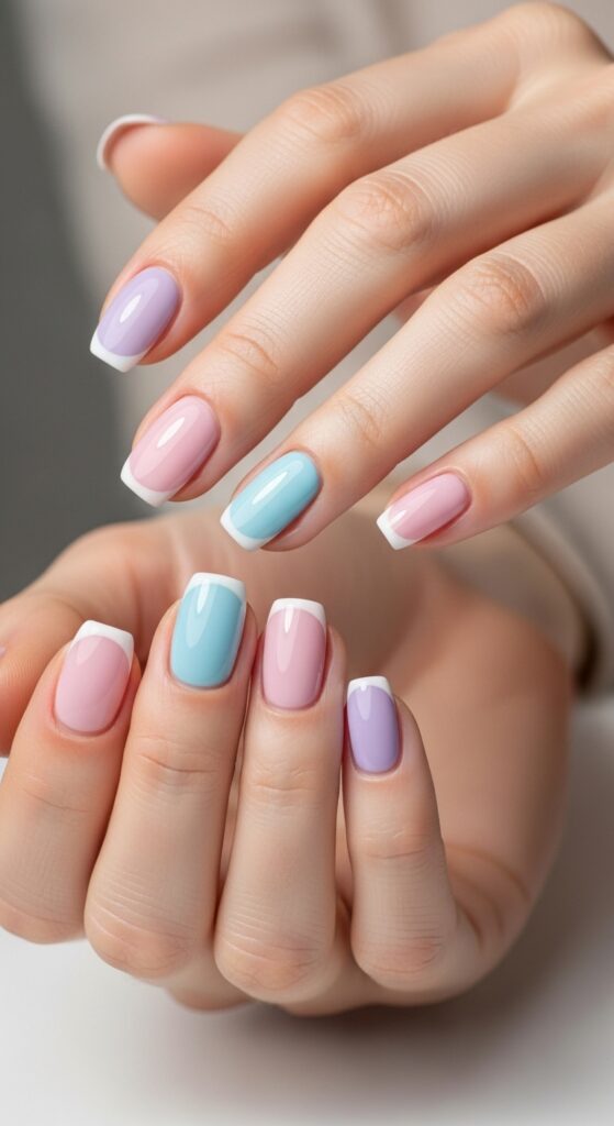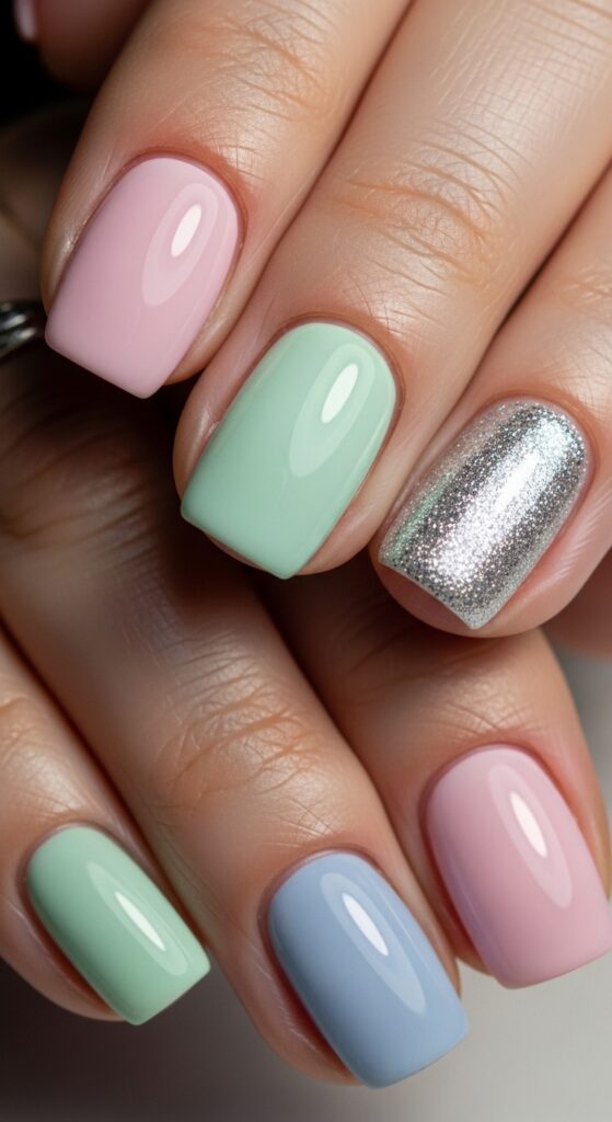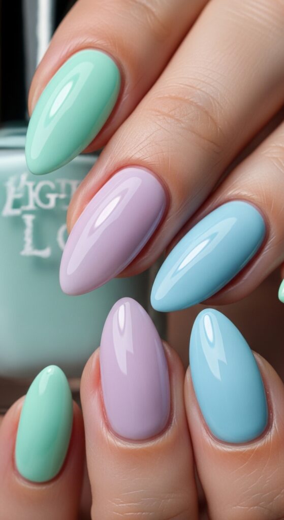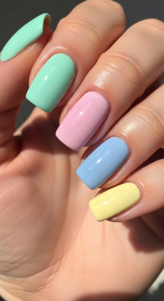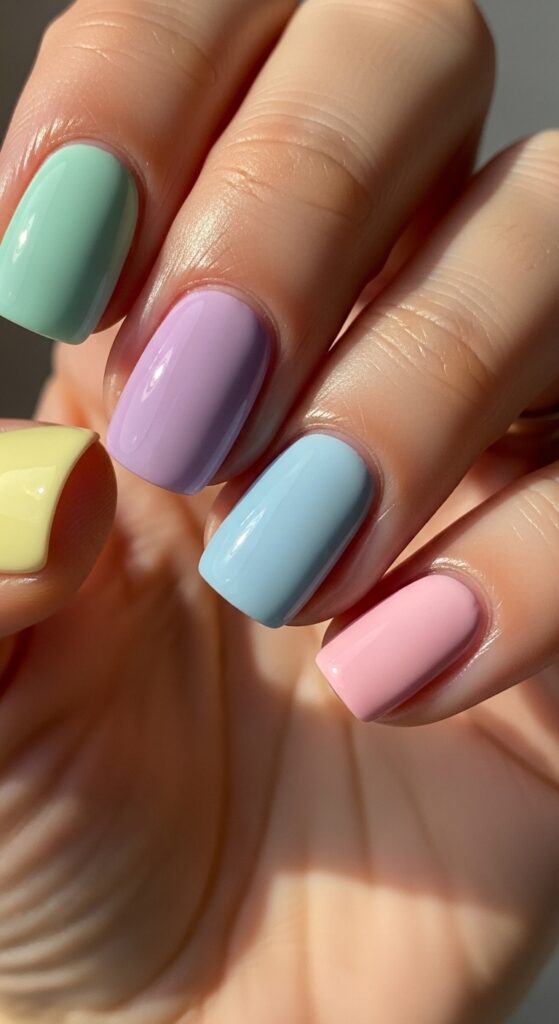 This look uses a different pastel shade on each nail, such as lilac, mint, baby blue, soft pink, and pale yellow. It creates a balanced, colorful manicure without being too bold. A glossy finish enhances the softness of the colors.