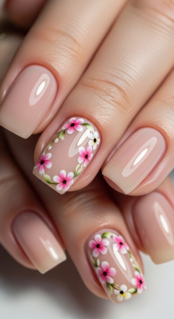 Floral nails are a classic spring choice. You can paint tiny flowers on one or two accent nails while keeping the rest neutral, or go for a full floral design across all nails. Popular options include roses, daisies, and cherry blossoms, often paired with nude or pastel bases.