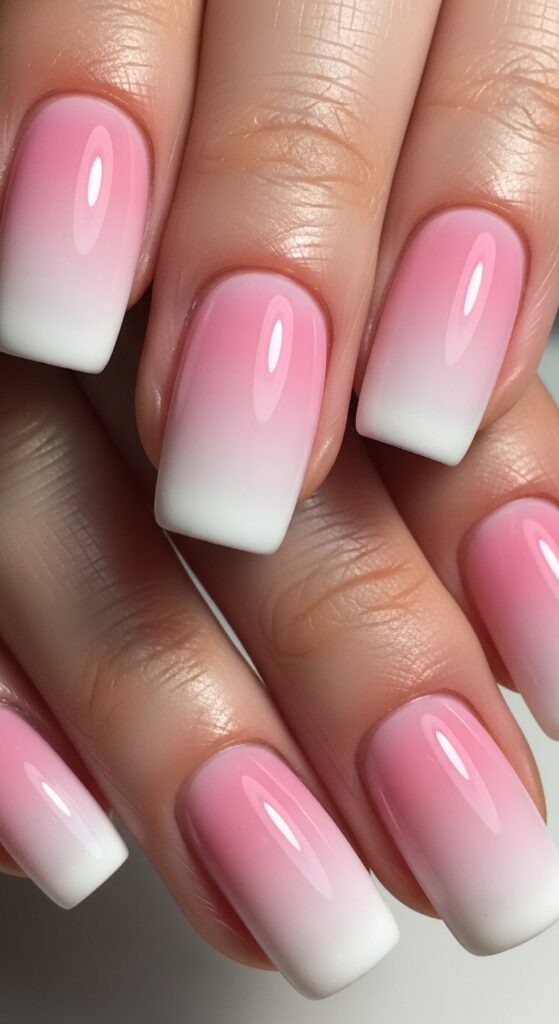 Ombre nails blend two shades seamlessly, usually from pink to white. This gradient effect creates a smooth transition and gives the nails a soft, elegant finish.