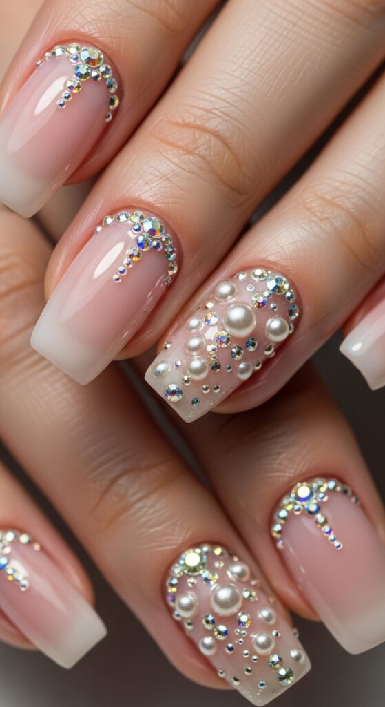 Gemstone nails incorporate small crystals, rhinestones, or pearls placed strategically on the nail. They add texture and shine, making the manicure feel more luxurious.