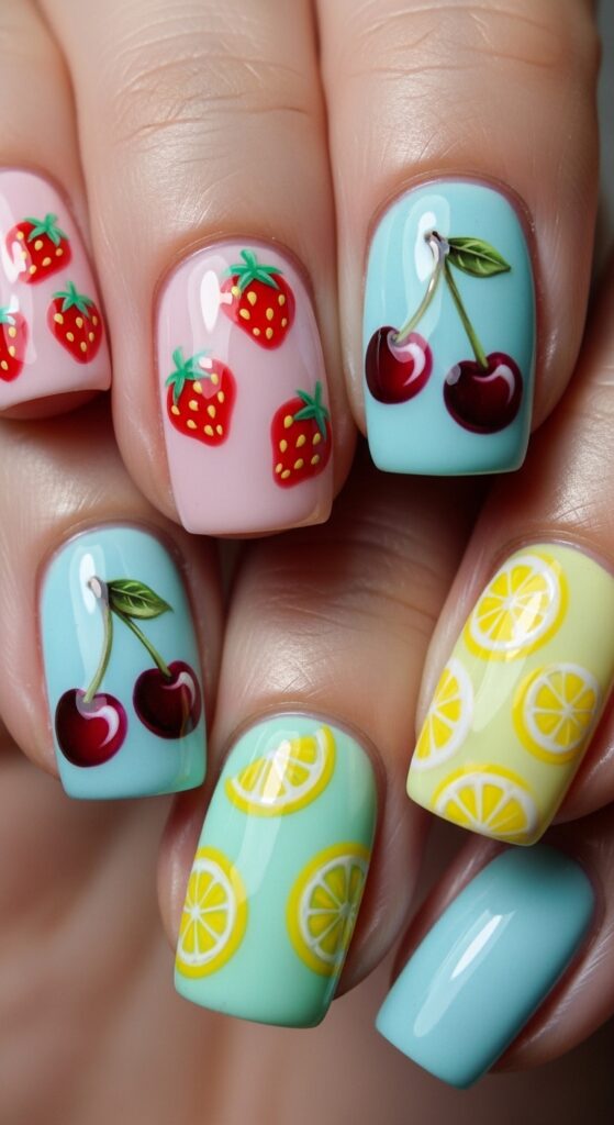 Fruity nails bring a playful and youthful vibe. Small illustrations of strawberries, cherries, oranges, or lemons add color and personality. These designs usually work best on short to medium nails with a glossy finish to enhance the fresh look.