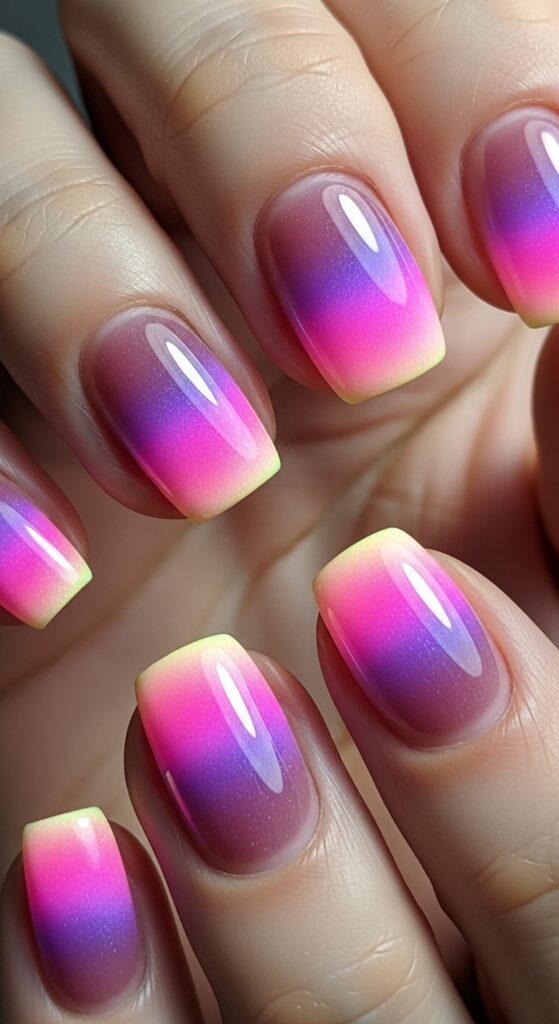 Aura nails feature a soft, airbrushed gradient effect that blends two or more colors. Typically, a lighter base is combined with a deeper shade in the center, creating a glowing appearance. Pink and purple combinations are especially popular in spring.