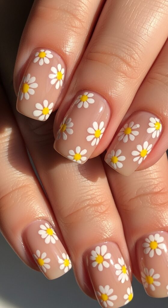 Daisy designs are simple yet eye-catching. Small white petals with yellow centers placed over a sheer or nude base create a fresh and clean look. This style works well for both short and long nails and suits everyday wear.