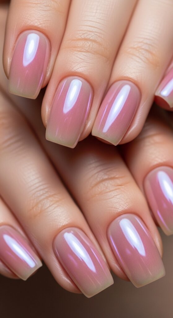 This trend focuses on a sheer or pale base with a pearlescent chrome finish. The result is a shiny, reflective surface that looks smooth and polished. It is subtle yet sophisticated, making it suitable for both casual and formal occasions.