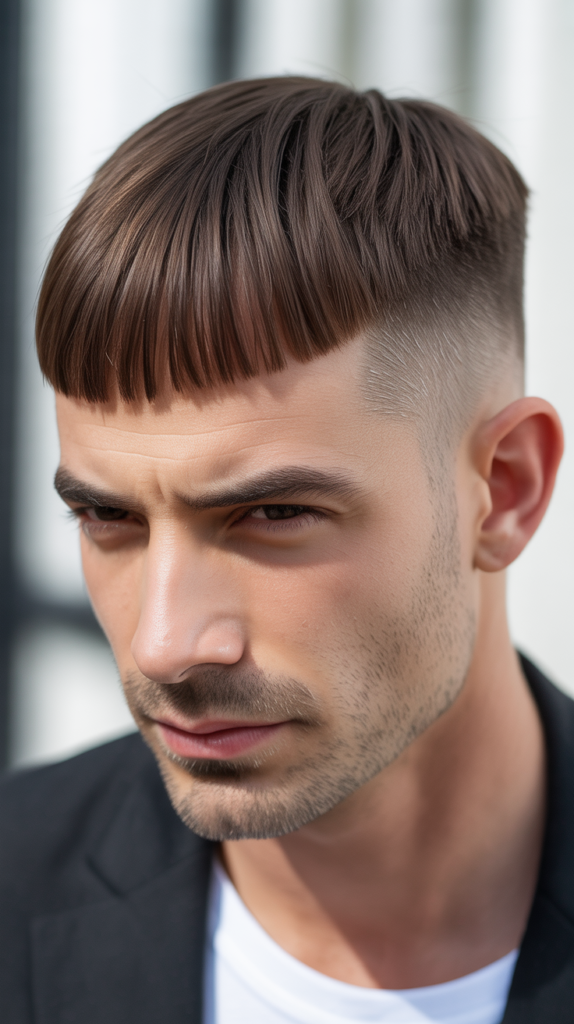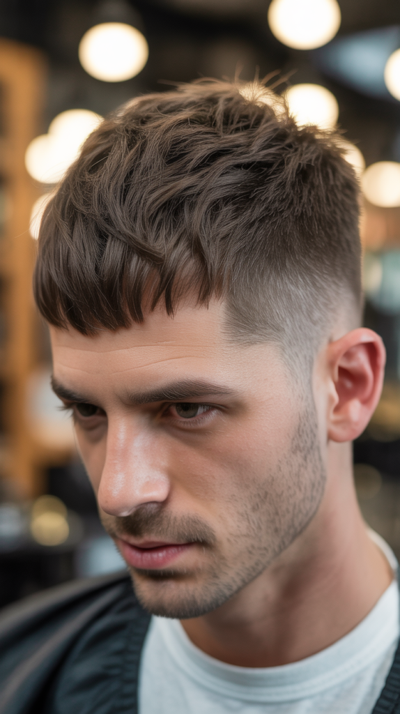 Styling Tip: Ask your barber for a skin or low fade on the sides to contrast the heavier top. Style the fringe forward with a flat brush and matte paste. Avoid any backward styling that would lift the fringe and defeat the purpose.