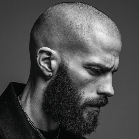 Why it works for thinning hair: The beard redirects all visual attention to the lower half of the face. The contrast between the clean shaved head and the textured beard creates a striking, deliberate aesthetic that looks completely confident and considered.