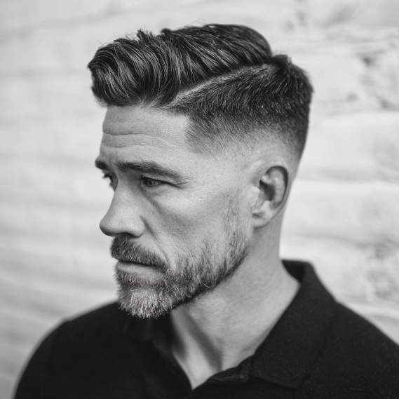 Styling Tip: A small amount of light-hold cream worked through the top and combed to one side with a soft part is all this cut needs. Keep the product minimal. The cleaner the styling, the sharper this cut looks.